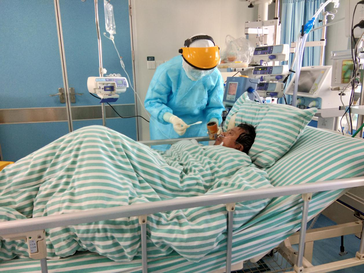 一接手重癥區的工作,我們立刻遇到了“下馬威”,7床的重癥患者“七叔”昏迷不醒,渾身布滿了氣管插管、深靜脈插管、導尿管等生命支持管道,必須依靠呼吸機維持生命。在我們的精心治療下,他的病情很快得到了明顯的控制。睜開雙眼后第一個看到的就是我們,七叔對我們感激不盡:“謝謝你們的照顧,你們是我的救命恩人啊!”