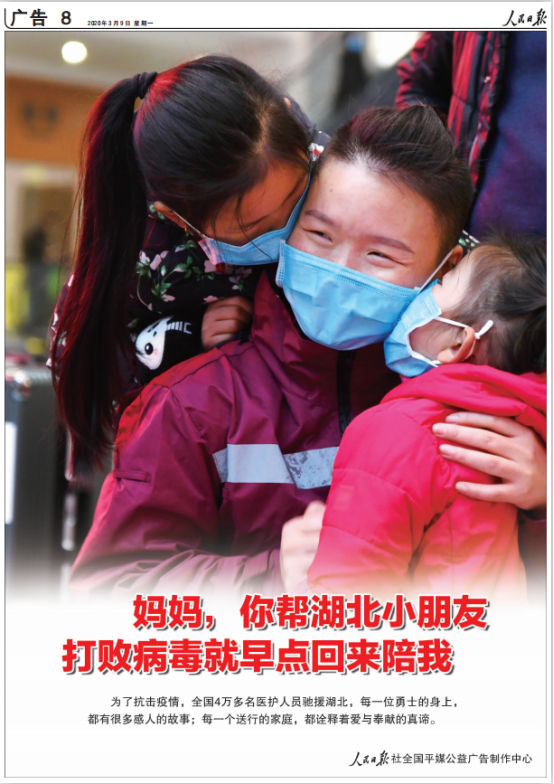 在3月9日的《人民日報》公益廣告版,一張兩個孩子親吻媽媽的照片占據了一個整版。圖中的媽媽名叫葉生瀅,是我院心血管內科的一名護士。2月21日,她作為醫院第四批援鄂醫療隊隊員出征湖北,在武漢市中心醫院重癥病區工作。這張圖是出征儀式上,她與自己的兩個女兒道別的場景。