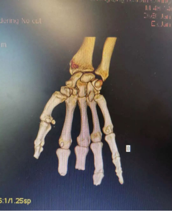 在放射科的支持下,醫院對患者雙手進行了CT三維重建,通過技術處理,虛擬出了患者缺失的手指,再使用新型材料打印出3D模型,模擬患者的斷指。通過對3D模型進行設計取樣,對患者右拇指、中指精準再造。