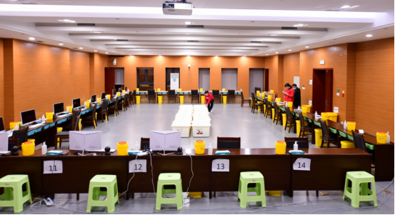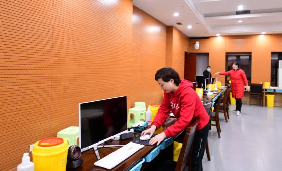 考慮到市民接種量需求逐日增加,區人民醫院將101及102會議室設置為臨時接種點,信息科、后勤保障部及其他科室志愿者集體出動,利用夜晚時間為60臺電腦布置網絡并接入疫苗接種系統,嚴格按照流程規范布置場地,保證接種點能順利運行。