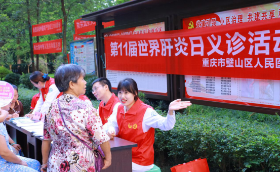 這是“重慶市璧山區人民醫院世界肝炎日義診”活動現場,雖然高溫酷暑,但并未影響肝膽外科團隊的熱情,前來咨詢的居民也絡繹不絕。汗珠掛在醫護人員臉上,但他們無暇擦拭,而是忘我地解答群眾的相關問題。