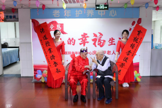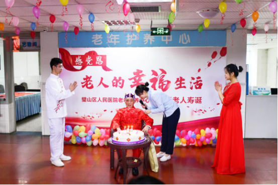 “一年有365個(gè)日出,我送你365個(gè)祝福……”在重慶市璧山區(qū)人民醫(yī)院老年護(hù)養(yǎng)中心傳來了歡快嘹亮的歌聲,這是一位百歲老人的生日現(xiàn)場。院黨委書記劉鴻、副院長郭進(jìn)軍(主持行政工作)、副院長彭彩碧攜護(hù)養(yǎng)中心的“醫(yī)護(hù)兒女”為冉茂常爺爺送上了蛋糕、鮮花與祝福,并齊唱起了《365個(gè)祝福》。