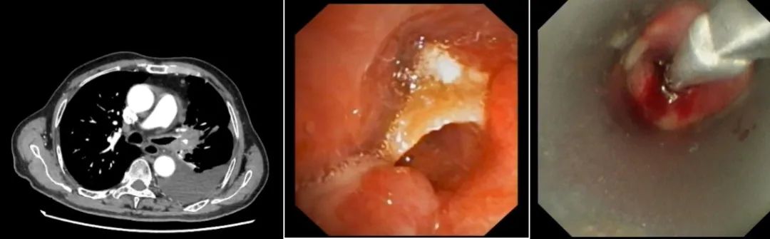 主管醫生冉雪梅為患者完善了胸部CT檢查,考慮“支氣管異物”可能性大,且病變已經嵌入支氣管壁內,極其危險,且患者病史較長,周圍肉芽組織增生明顯,引起阻塞性肺炎,反復咳嗽、咳膿痰,院外多次行支氣管鏡檢查,但未能成功取出該異物。