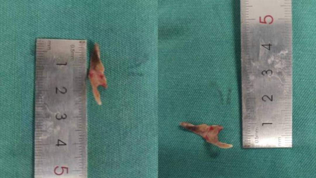 經過綜合評估、完善相關檢查、排除手術禁忌后,呼吸與危重癥醫學科譚繼玲副主任醫師、王開金副主任醫師帶領介入團隊為患者實施了“軟硬鏡結合下異物取出術”。術中可見患者左主支氣管開口大部阻塞,此“異物”質硬類似骨質。由于異物較大,且嵌頓于左主支氣管,異物周圍支氣管肉芽組織增生,這種手術大出血的風險極大,隨時做好搶救出血的準備,最終憑借嫻熟的技術,成功將卡在左主支氣管的異物取出(異物為骨頭,邊緣銳利,大小26mmx10mm)。取出異物后,王開金副主任醫師認為患者粘膜異常,不排除合并腫瘤,因此同步行活檢,最終病理結果確診為鱗癌。