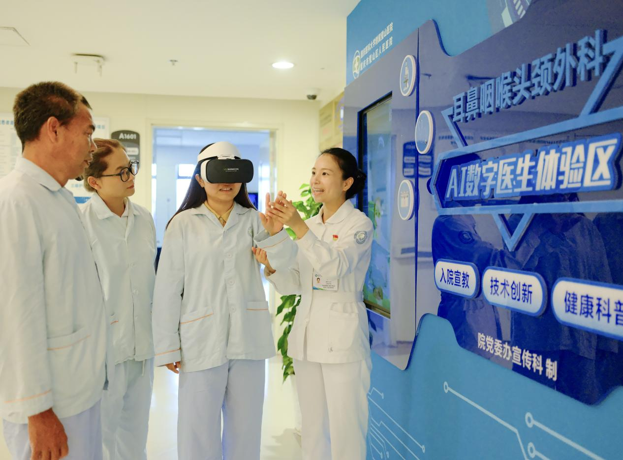患者與“AI數(shù)字醫(yī)生”互動問答這一幕出現(xiàn)在重慶醫(yī)科大學(xué)附屬璧山醫(yī)院(重慶市璧山區(qū)人民醫(yī)院)耳鼻咽喉頭頸外科住院病區(qū)。在該病區(qū)的“AI數(shù)字醫(yī)生”體驗區(qū),患者黎女士指尖輕觸大屏,通過簡單的語音對話,便快速獲得了關(guān)于鼻竇炎手術(shù)前準(zhǔn)備的專業(yè)指導(dǎo)。