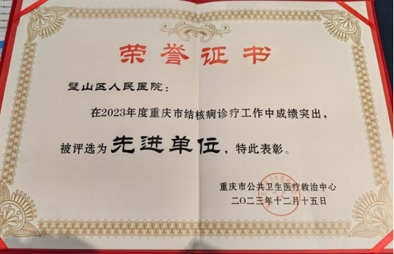 2023年12月15日,結核病診療管理工作年度總結會在沙坪壩區舉行。本次會議上,市結核診療質量控制中心對該工作取得優異成績的醫療機構進行了表彰,我院獲得該榮譽。