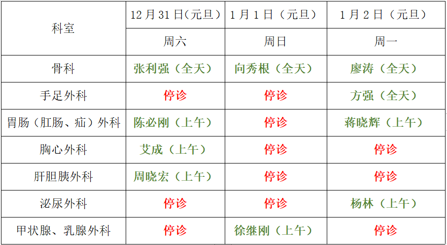 重慶市璧山區人民醫院(東關院區)元旦期間暫停門診接診,此次停診的科室包括:全科醫學科、老年病科、中醫科、中醫針灸科、康復醫學科及手足外科。