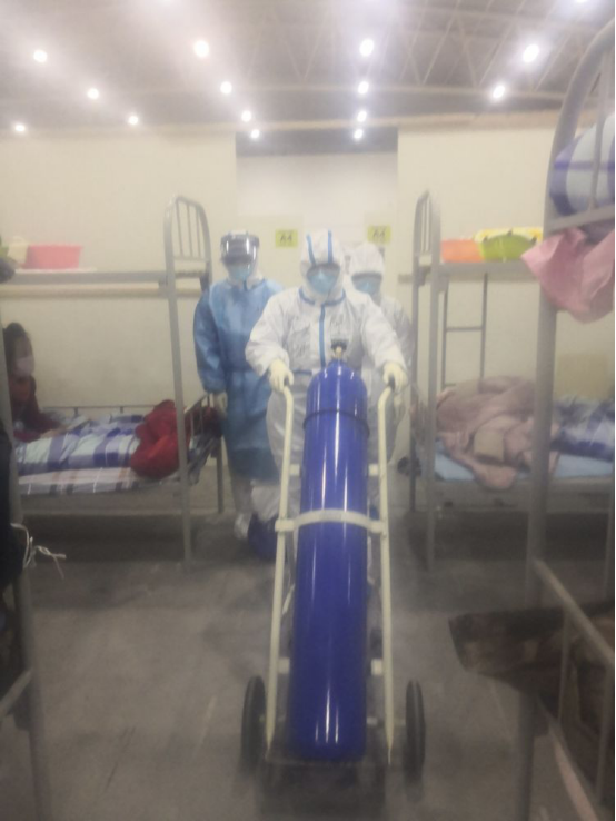 客廳方艙醫(yī)院的投用比較匆忙,里面的很多設(shè)施都不夠完善。我服務(wù)的一位患者的氧飽和度突然下降到85%,使用氧氣袋也無濟于事,情急之下,我立刻大喊:“上氧氣筒!”