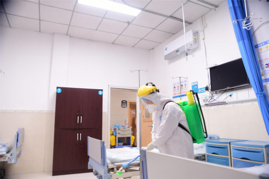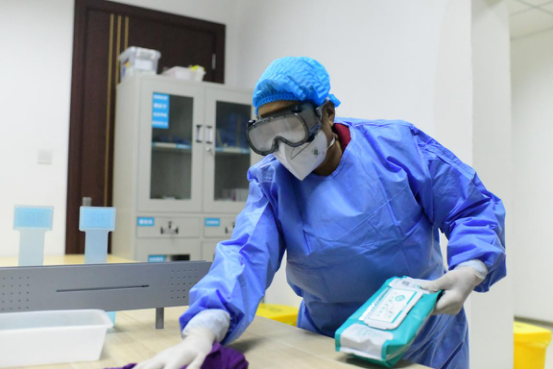 通過扶梯來到2樓,看到有工作人員正在對地面進行消毒。他們說,這是他們每天早、晚都要做的事情,座椅、走廊、診室,一個死角都不放過。除日常清潔消毒外,還重點加大了電梯、扶梯、門把手的消毒,對診療儀器、公用輪椅等每用1次就會消毒1次。非常時期,消毒操作必須做到“寸土不讓”!