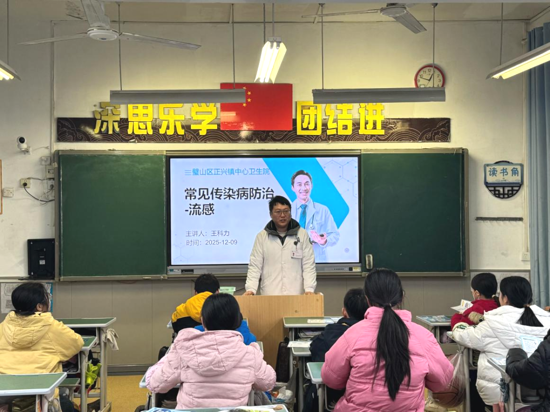 目前正處于流感高發季節,為筑牢校園健康防線,增強師生健康防護意識。近日,重醫附屬璧山醫院派駐團隊醫生王科力帶領正興醫院的醫生在正興小學開展了一場常見的傳染病防治相關健康教育知識講座。