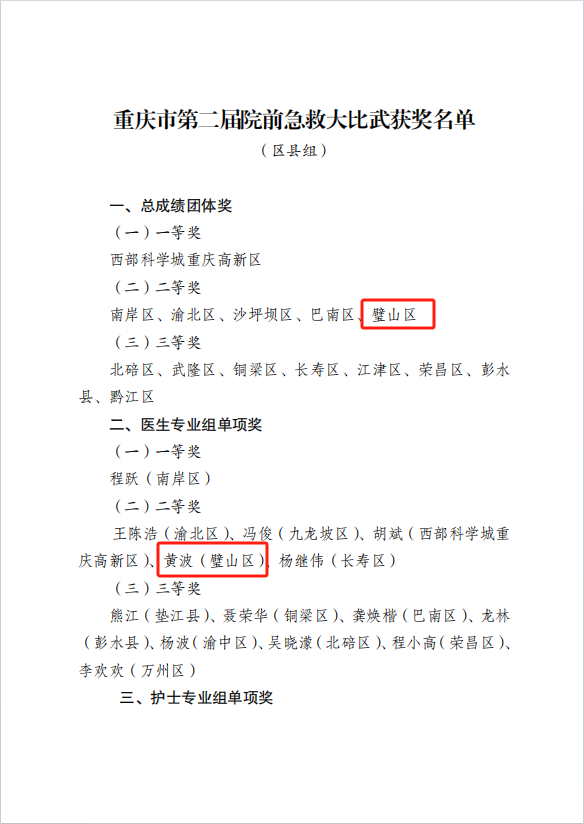 為進一步加強全市院前急救隊伍能力建設,更好地為人民群眾提供優(yōu)質(zhì)高效的院前急救服務,5月23日至24日,由市衛(wèi)生健康委組織開展的第二屆全市院前急救大比武在南岸區(qū)舉行。重慶醫(yī)科大學附屬璧山醫(yī)院(重慶市璧山區(qū)人民醫(yī)院)院前急救團隊代表璧山區(qū)參賽,經(jīng)過激烈的角逐,在41個區(qū)縣隊伍中脫穎而出,榮獲區(qū)縣組團體二等獎,黃波醫(yī)生獲專業(yè)組個人二等獎。